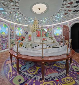 Вход в здание охраняет голова великана изо рта, которого стекает водопад, а глаза выполнены из зеленых кристаллов, он приглашает всех насладиться уникальными и королевскими бликами драгоценных камней. Заходя внутрь вас поразит блеск и великолепие экспонатов, это как будто сказочная сокровищница где хрусталь перевоплотился в различные формы и поражает своим блеском, благодаря особой технологии обработки.